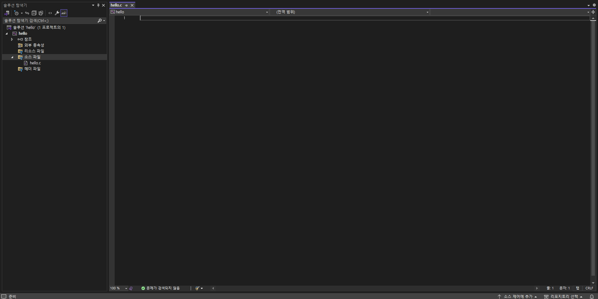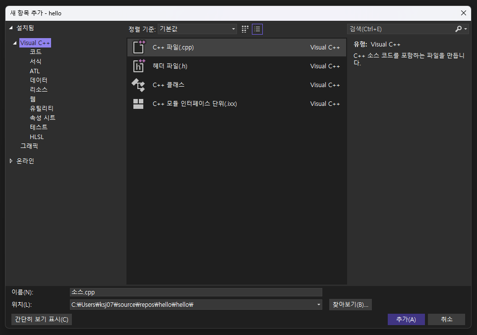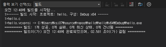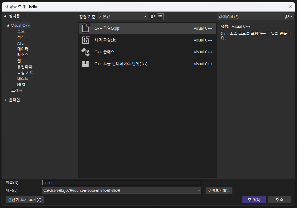 ** C++파일을 선택했으나, 파일 확장자가 .c이므로 비쥬얼 스튜디오에서 알아서 C 컴파일러로 컴파일 해준다.