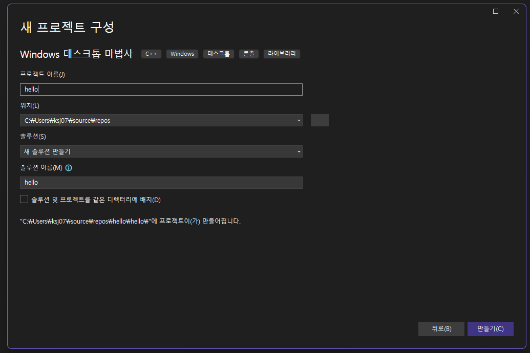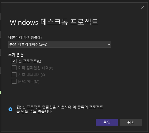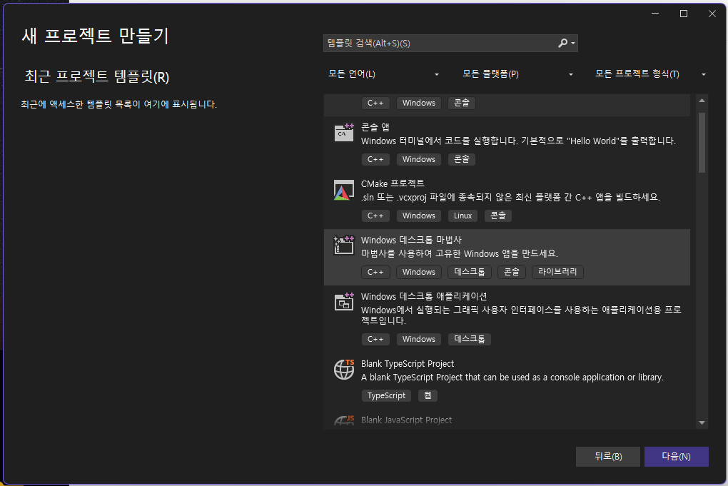 Windows 데스크톱 마법사를 선택해서 프로젝트를 생성해주자.