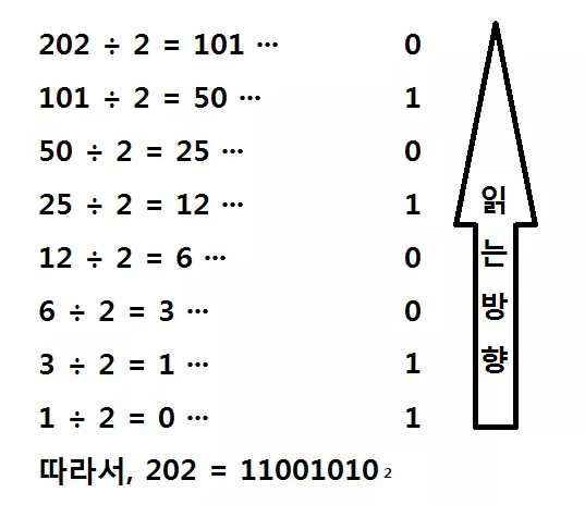 해당 10진수 값을 2로 나누어서 몫이 0이 될때 까지 나눈 다음에 마지막 나머지(0이 되기전 나머지)부터 역순으로 읽어주면 된다.