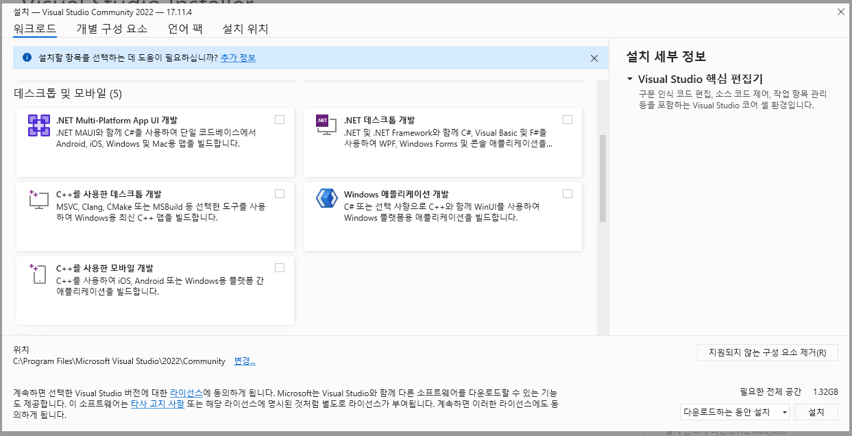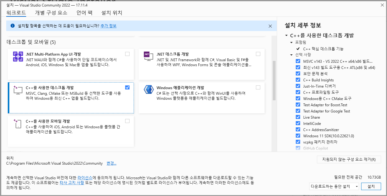 C++를 사용한 데스크톱 개발을 선택해주고