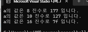 이는 인자의 값을 출력하는 형식으로 %o의 경우는 들어올 인자의 값(위의 예로는 a)을 8진수로 출력하라는 의미이고, %x의 경우는 16진수로 출력하라는 의미가 된다.