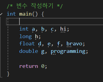- 변수명은 영어, 숫자, _ 로만 구성되어 있어야한다.(비주얼 스튜디오같은 컴파일러의 경우는 유니코드(한글포함)로 변수이름을 작성해도 문제는 없는데 관습상 코드는 모두 영어로 작성하는게 좋다 )