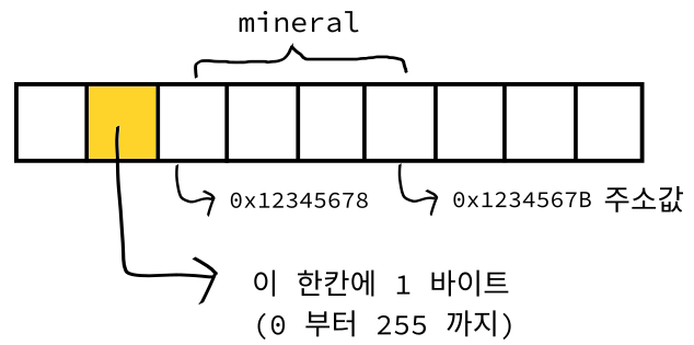 내가 어떤 데이터를 mineral이라는 변수에 저장했다고 한다면, 컴퓨터는 알아서 메모리의 어딘가에 mineral 에 방을 주고 그 내용을 저장한다.