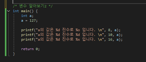 대신 %d가 출력된 자리에 a의 값이 출력되고 있는데 %d는 a의 값(정확하게는 ""뒤에 초는 첫번째 변수)을 10진수로 출력하라는 의미가 된다.