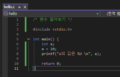 이때 주의할 점은 오래된 버전의 C언어(C89)를 사용하는 경우라면 변수는 항상 최상단에서 선언해줘야한다.