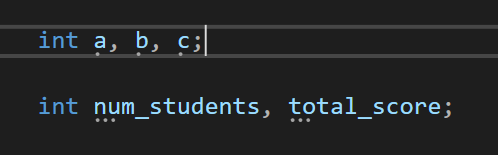 - 변수명은 영어, 숫자, _ 로만 구성되어 있어야한다.(비주얼 스튜디오같은 컴파일러의 경우는 유니코드(한글포함)로 변수이름을 작성해도 문제는 없는데 관습상 코드는 모두 영어로 작성하는게 좋다 )