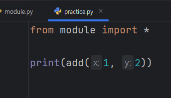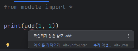 또한 * 이 아니라 명칭을 직접 작성해주면 모듈 내부에서 해당 기능만 가져다 사용도 가능하다.