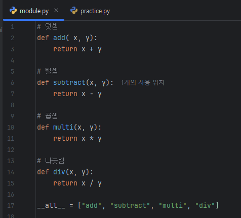 이렇게 명칭을 리스트의 형태로 구현해주면 외부에서 from - import * 을 사용해서 모듈을 import했을때