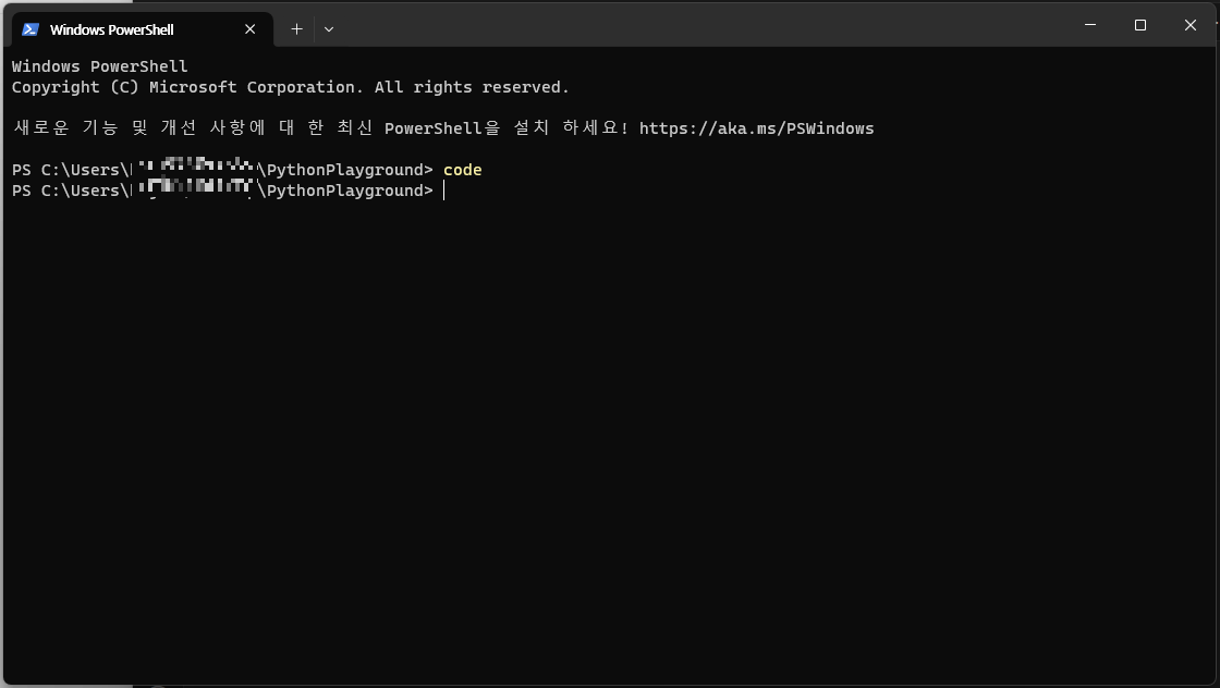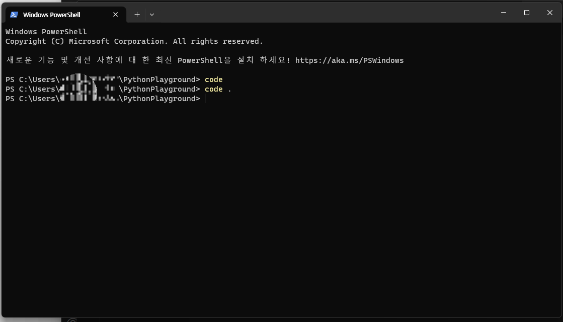 4. code .(마침표)을 입력하면 해당 폴더를 작업공간으로 설정하여 VSCode가 열린다.