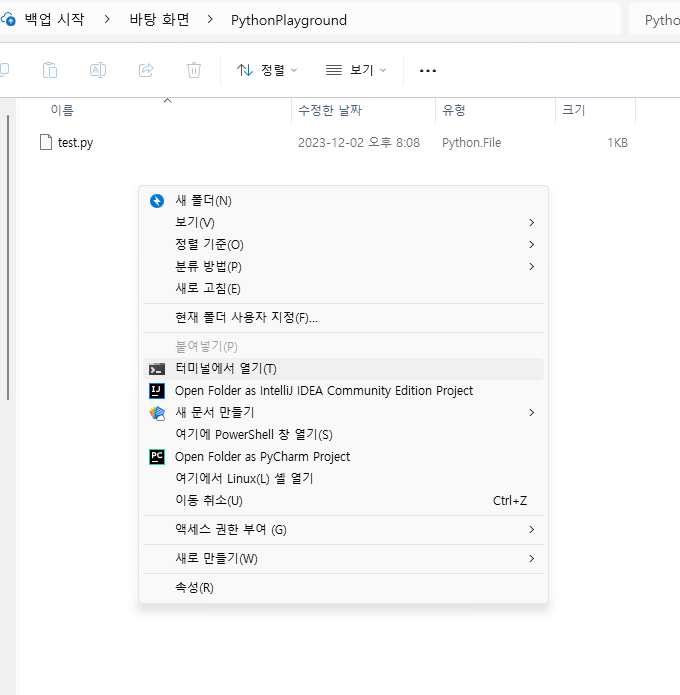 2.터미널에서 열기를 선택하여 power shell을 실행한다.