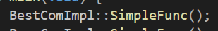 이 부분은 BestComImpl라는 이름공간에 존재하는 SimpleFunc()를 호출하겠다는 의미로 사용되는 코드로 namespace와 함수 사이에 존재하는 ::연산자는 범위지정 연산자로 어디에 있는 어떤 함수를 선언할것인지를 연결해주는 연산자이다.