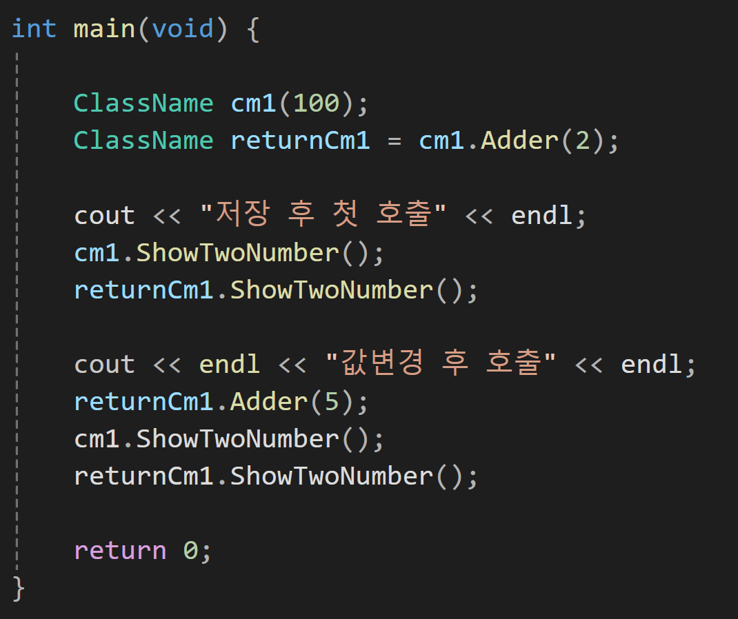 이렇게 선언하면 *this를 참조자 형태로 반환하기에 사실 cm1과 returnCm1은 같은걸 의미하게 된다.