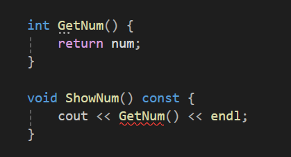 정확하게는 컴파일러가 컴파일 할때 ShowNum 함수 안으로 들어 올때 아 이건 const로 내부에서 멤버변수의 값을 변경시키지 않겠구나 하고 들어와서 GetNum 함수를 만난다.
