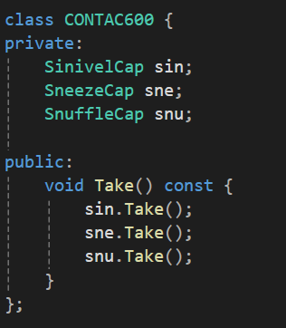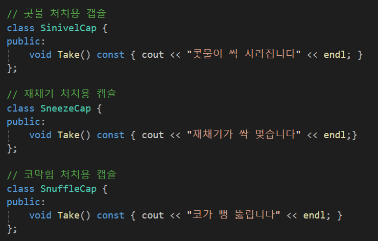 만약 콧물과 재채기와 코막힘이 동시에 동반되지 않고, 약을 복용함에 있어서 쉽게 조합이 가능하다면(약을 콧물약 >> 재채기 >> 코막힘 약의 순서대로 먹어야한다라던가 등의 제한이 있는 경우) 위처럼 만드는 것이 캡슐화를 잘 했다고 할 수 도 있다.
