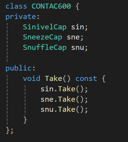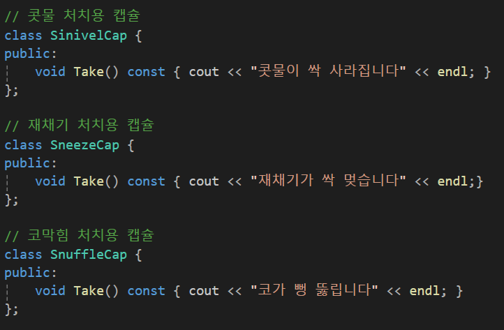 만약 콧물과 재채기와 코막힘이 동시에 동반되지 않고, 약을 복용함에 있어서 쉽게 조합이 가능하다면(약을 콧물약 >> 재채기 >> 코막힘 약의 순서대로 먹어야한다라던가 등의 제한이 있는 경우) 위처럼 만드는 것이 캡슐화를 잘 했다고 할 수 도 있다.