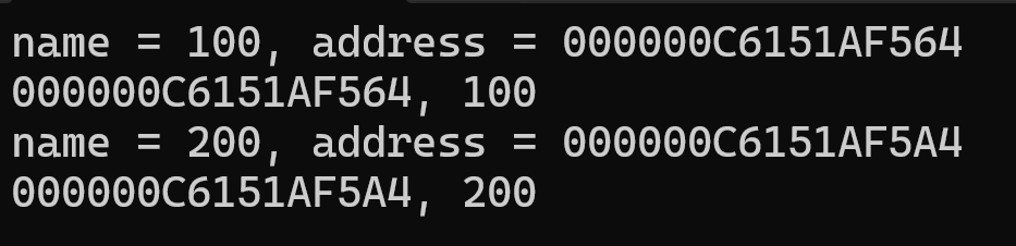 객체를 생성하면서 100을 전달하고 그 주소값과 값을 출력한다.