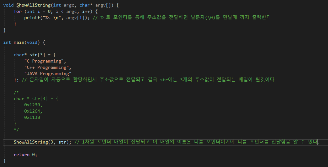 와 같은 형태로 함수가 선언된다면 이 함수의 매개변수에 있는 char * arr[]가 char ** arr로 변경할 수 있다는 것을 알아야하고 전달 받고자 하는게 char형 포인터 배열의 이름임을 알 수 있어야 한다.