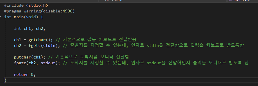 위와 동일하게 getChar의 경우는 값을 키보드로 입력을 받고 fgetc의 경우는 입력받을 장치를 무엇을 사용할지 결정할 수 있다.