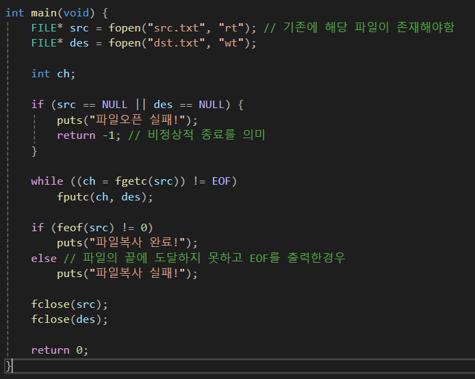 반환값이 EOF인 경우에만 while문을 종료시키고 fp를 닫아준다.