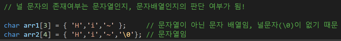 만약 널 문자가 없다면 이 문자열의 시작점은 배열의 시작점이기 때문에 인식할 수 있으나 컴퓨터가 이 문자열의 종료지점을 인식할 수 없다.