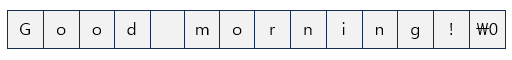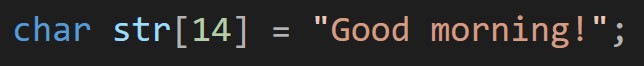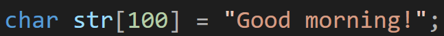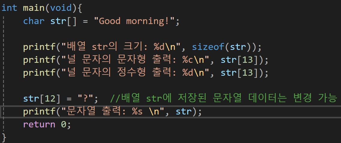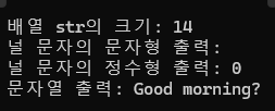 마지막에 널문자가 들어가기에 Good morning!은 13개의 문자열이지만 14의 길이를 가진 char 배열을 생성해야만 한다.