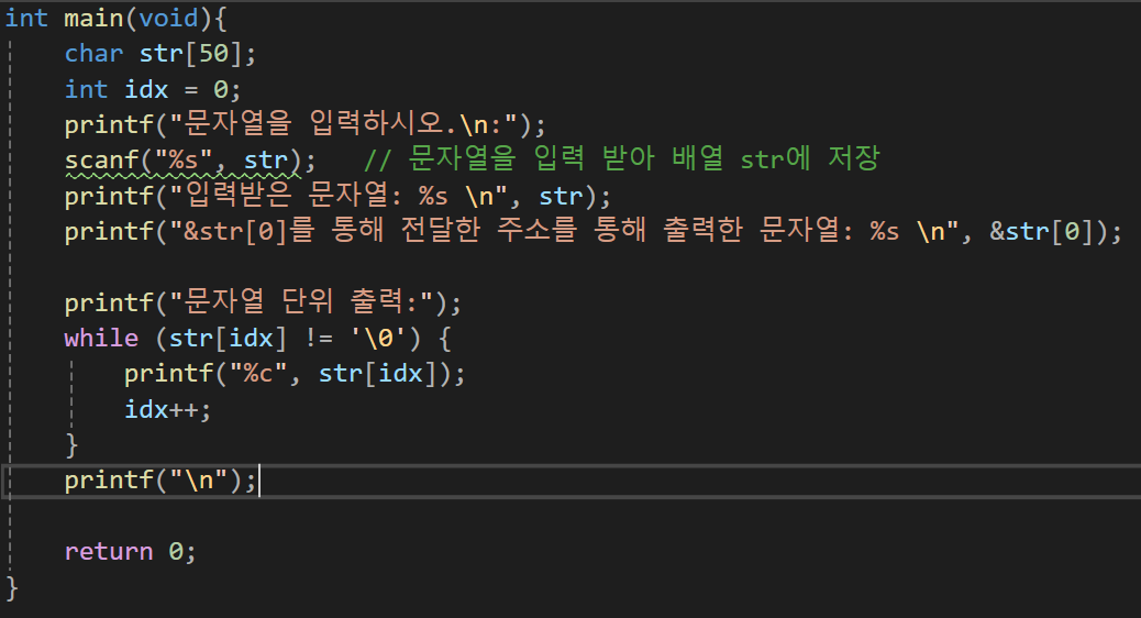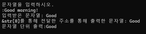 그리고 printf에서 %s를 넣고 str을 넣으면 전체 문자열을 모두 출력하는 것은 printf에서의 %s는 문자열의 시작부분의 주소값을 전달받아 처리하라고 지시를 내리고 printf는 널 문자(\0)를 만날때까지 내부적으로 루프를 실행하여 모든 문자를 순차적으로 출력해준다.