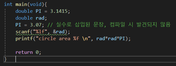여기서 PI는 절대 변경되지 않을 값인데, 중간에 어떤 이유로 잘못된 코드가 삽입되어 있다고 생각해보자.