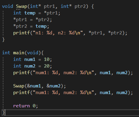 이렇게 주소값을 갖고 접근해야지만 Swap함수 외부인 main함수에 선언되어 있는 num1과 num2에 접근해서 그 값을 Swap함수 내부에서 변경을 할 수 있다.