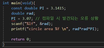 여기서 PI는 절대 변경되지 않을 값인데, 중간에 어떤 이유로 잘못된 코드가 삽입되어 있다고 생각해보자.