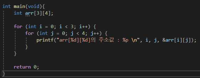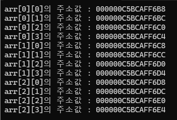 그렇기에 이 코드를 실행했을때 a[0][3]과 a[1][0]의 차이가 타입의 크기인 4가 나면서 연속적으로 구성되어 있는 것을 확인한다면