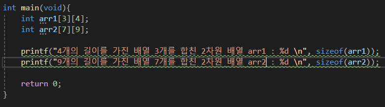 4 * 3 * 4(타입의 데이터 크기)를 했을때 나오는 값이 48인것을 알 수 있고 arr2의 경우는 9 * 7 * 4를 했을때 252가 나오는 것을 보면서 배열이 우리가 예상한대로 생성되었음을 알 수 있고 어떤 형태를 가질지도 알수 있다..