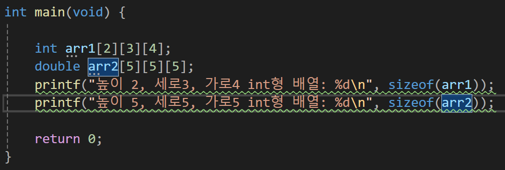 이 내용을 봤을때 이차원 배열과 동일하게 우리가 생성한 3차원 배열의 크기를 보면서 그 형태를 가늠하고 있는데 arr1의 경우는 2 * 3 * 4 * 4(int의 크기)로 96이 나오고, arr2의 경우는 5 * 5 * 5 * 8(double의 크기)로 1000이 나오는 것을 보면서 그 형태가 우리가 계속 그려왔던 형태임을 추측할 수 있다는 것을 보여준다.