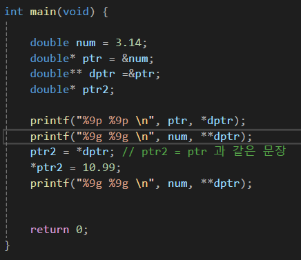 위 상황에서 *dptr은 포인터 변수 ptr을 의미하고 *(*dptr)은 변수 num을 의미하게 된다.