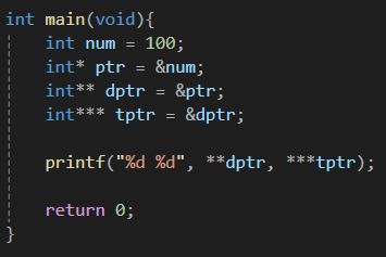 위 상황에서 *dptr은 포인터 변수 ptr을 의미하고 *(*dptr)은 변수 num을 의미하게 된다.