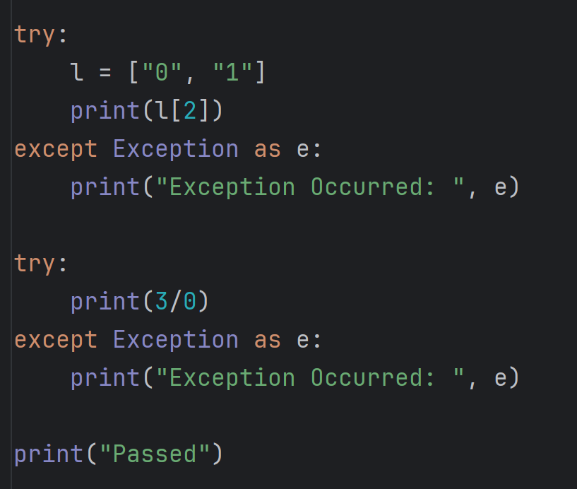 이럴때 그냥 어떤 에러인지 작성하지 않고 Exception으로 지정해주면서 as e를 사용하면 어떤 에러가 발생했는지를 확인할 수 있을 뿐만 아니라 모든 에러에 대해서 Exception 처리를 해줄 수 있어 편리하다.