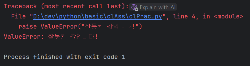 여기서는 ValueError를 사용했으나 이 Error의 종류를 클래스로 사용자가 만드는것도 가능하다.