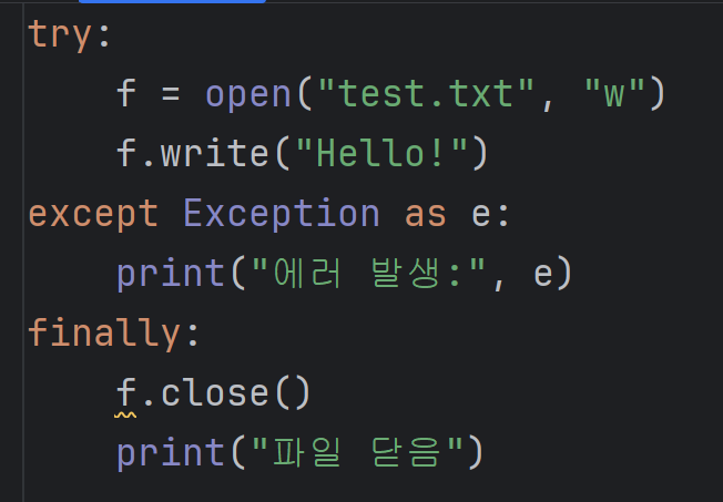 finally 구문은 else처럼 마지막 구문에 붙여 추가하는 구문으로 esle랑은 다르게 에러가 있건 없건 무조건 실행되는 구문이다.