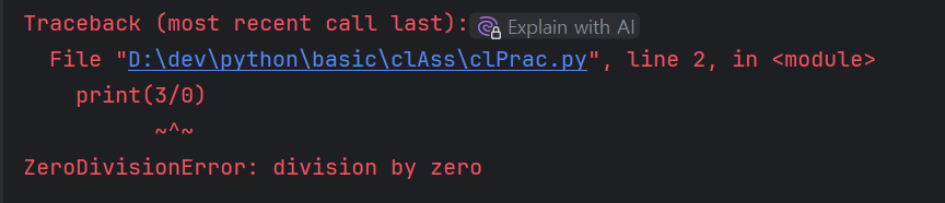 try의 아래에 있는 실행 코드 내부에서 exception이 발생하는 경우 보통은 아래와 같이 에러 구문이 출력되는데