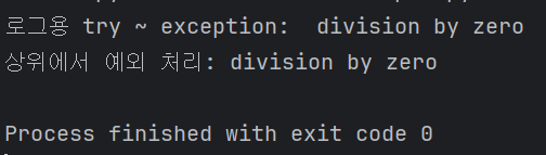 Exception이 발생한 시점 이후로 코드가 실행되지 않고 종료되는 것을 볼 수 있다.