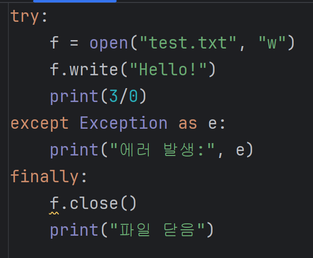 finally 구문은 else처럼 마지막 구문에 붙여 추가하는 구문으로 esle랑은 다르게 에러가 있건 없건 무조건 실행되는 구문이다.