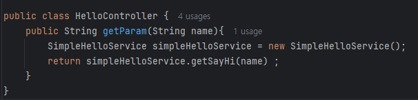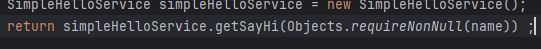 이렇게 문자열을 반환하던 부분을 SimpleHelloService의 함수를 호출해서 값을 반환하는 형태로 변경해주자.