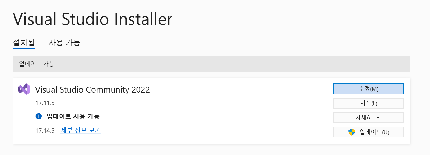 만약 기존에 Visual Studio가 설치되어 있다고 한다면 Visual Studio Installer 를 실행해서