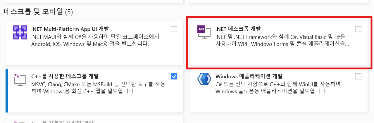 콘솔/기본 앱을 개발하기 위해서라면 .NET 데스크톱 개발을 선택하고