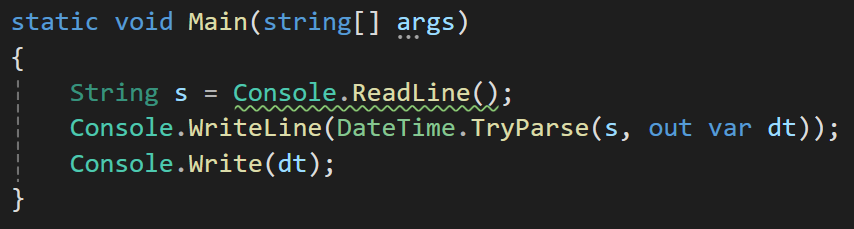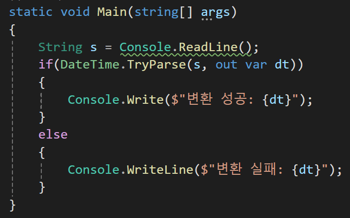 DateTime에 이를 사용하면 첫번째 인자로 전달하는 문자열이 날짜 타입인지를 확인하고 이 값을 변환해서 두번째 인자인 out var 변수 에 담아준다.
