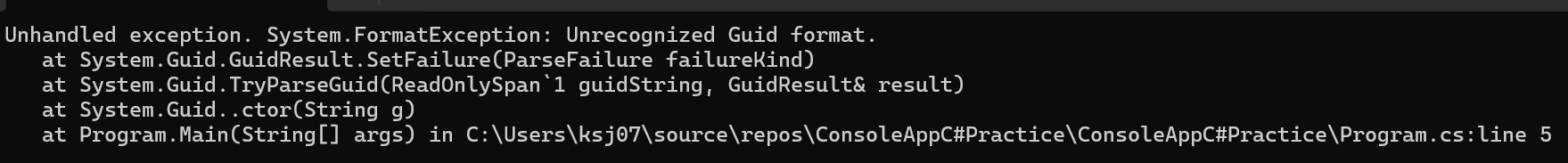 만약 전달하는 문자열이 GUID의 형태를 가지지 않을 경우엔 Exception을 벹는다