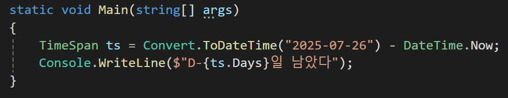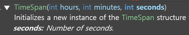 여기서 new TimeSpan을 할때에는 시, 분, 초 요소를 모두 넣어줘야만 생성이 가능하다.