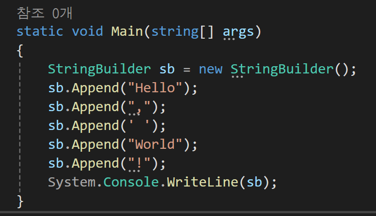 그렇기에 변수의 값이 자주 변경된다면 string이 아니라 StringBuilder를 사용하는것을 권장한다.