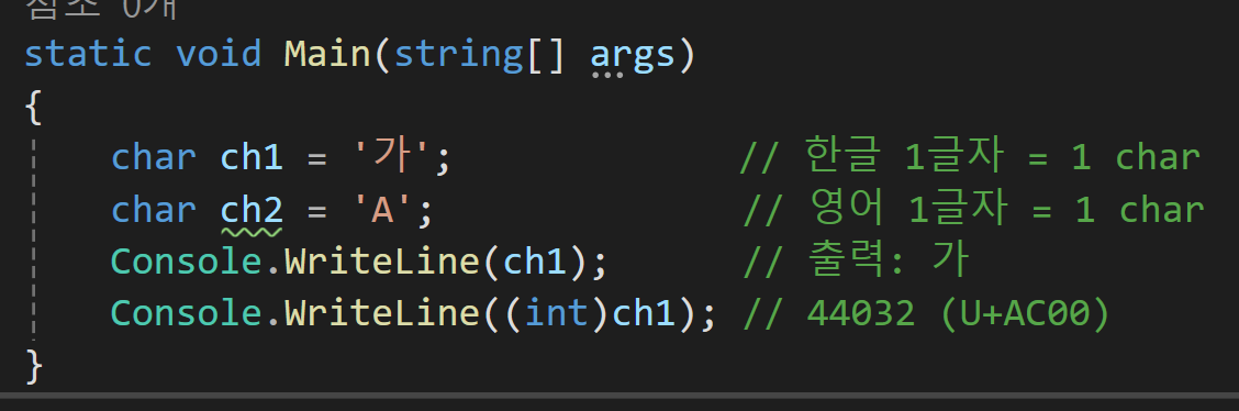 또한 보통 char형은 1바이트를 가지고 있지만 C#에서는 2바이트 크기를 가진다는 점이 다른 점이다.