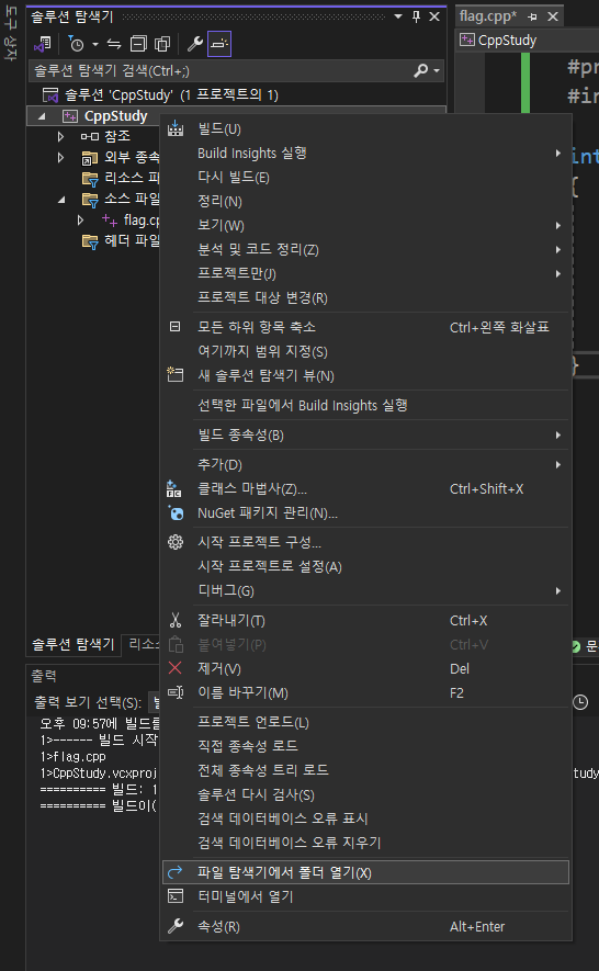 프로젝트에 우클릭을 해준 다음에 파일 탐색기에서 폴더 열기를 눌러주고