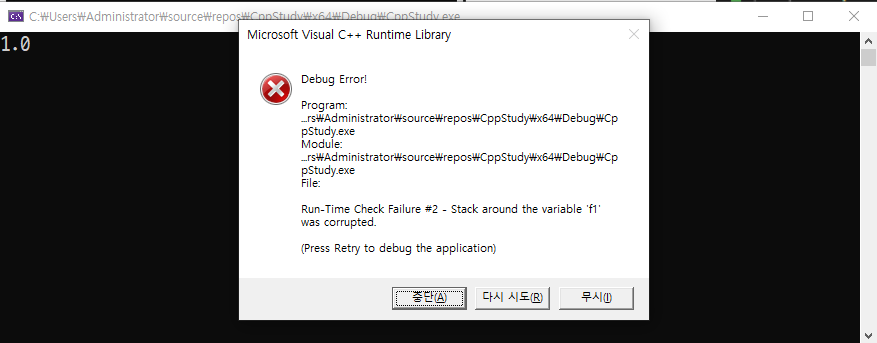 이는 4바이트의 변수에 8바이트의 값을 넣으려고 하기 때문에 생기는 일이다(scanf에 서식문자를 %lf를 사용하면 너가 입력한 값의 형태는 8바이트의 형태를 갖고 있어 -> float에 8바이트 데이터를 저장하려고 함 -> 크기를 넘어서서 에러를 발생시킴 )